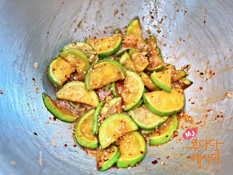 호박 1개, 참기름, 참깨소금 1큰술, 양념 – 다진파 3큰술, 다진마늘 2작은술, 고춧가루 1큰술, 식초 2작은술, 간장 1큰술 -계량숟가락-