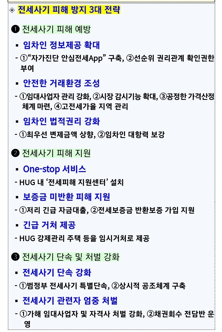 서울시는 2022년 8월부터 깡통전세 및 전세사기 피해 대응을 위해 ▲전세보증가율 등 전·전세정보 공개 ▲전세계약 체결 시 유의·확인사항 상담 ▲전세가격상담센터 운영 ▲불법중개행위 집중수사 등을 시행해 왔는데, 이번 대책은 깡통전세 중에서도 악의적 전세사기 피해자를 돕고 피해를 예방하기 위한 금융·법률지원 악성임대인에 대한 선제적 대응 잠재적 깡통전세로 인한 피해예방 총 3가지 방향이 추가됐습니다. ① 금융·법률 지원
