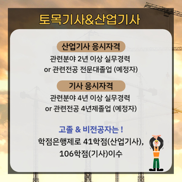 토목기술자 신용은행 시스템 직장 경험이 없는 고등학생이 온라인으로 했습니다!고등학교 졸업 후 다른 분야에서 일하다가 건설, 설계, 서비스, 토지개발, 주택 건설 등의 일자리를 얻었습니다.하지만 실제로 일을 시작했을 때 같은 분야에서 실무 경험이 없고 학력이 없는 고등학생이었기 때문에 받아들여지지 않았습니다.앞으로 승진하고 싶었고 나중에 직장을 바꾼다 하더라도 사양으로 사용할 수 있는 자격증이 꼭 필요했기 때문에 어떤 자격증이 좋은지 찾아보기 시작했습니다.그렇게 알게 되었습니다.산업기사 자격증은 도로, 공항, 항만, 철도 등에 대한 조사 및 연구, 계획, 설계, 공사 감리, 유지 및 보수를 포함하는 직업이었습니다.이것을 취득하면 승진할 때 우대되고 6급 기술 공무원을 채용할 때도 가산점이 주어졌습니다.너무 좋아 보여서 산업기사 자격증을 취득하기로 결심하고 어떻게 하면 될지 알아보기 시작했습니다. 하지만 이 시험은 아무나 볼 수 있는 시험이 아니었습니다. 일정 수의 사람만 시험을 볼 수 있었습니다. 처음에는 이 시험의 자격 조건이 무엇인지 몰랐기 때문에 찾아보았습니다. 사실 학력 기준이었습니다. 실무 경험이 없어도 교육부 학점은행 제도를 활용하면 온라인 수업을 통해 쉽게 자격 조건을 충족할 수 있습니다!