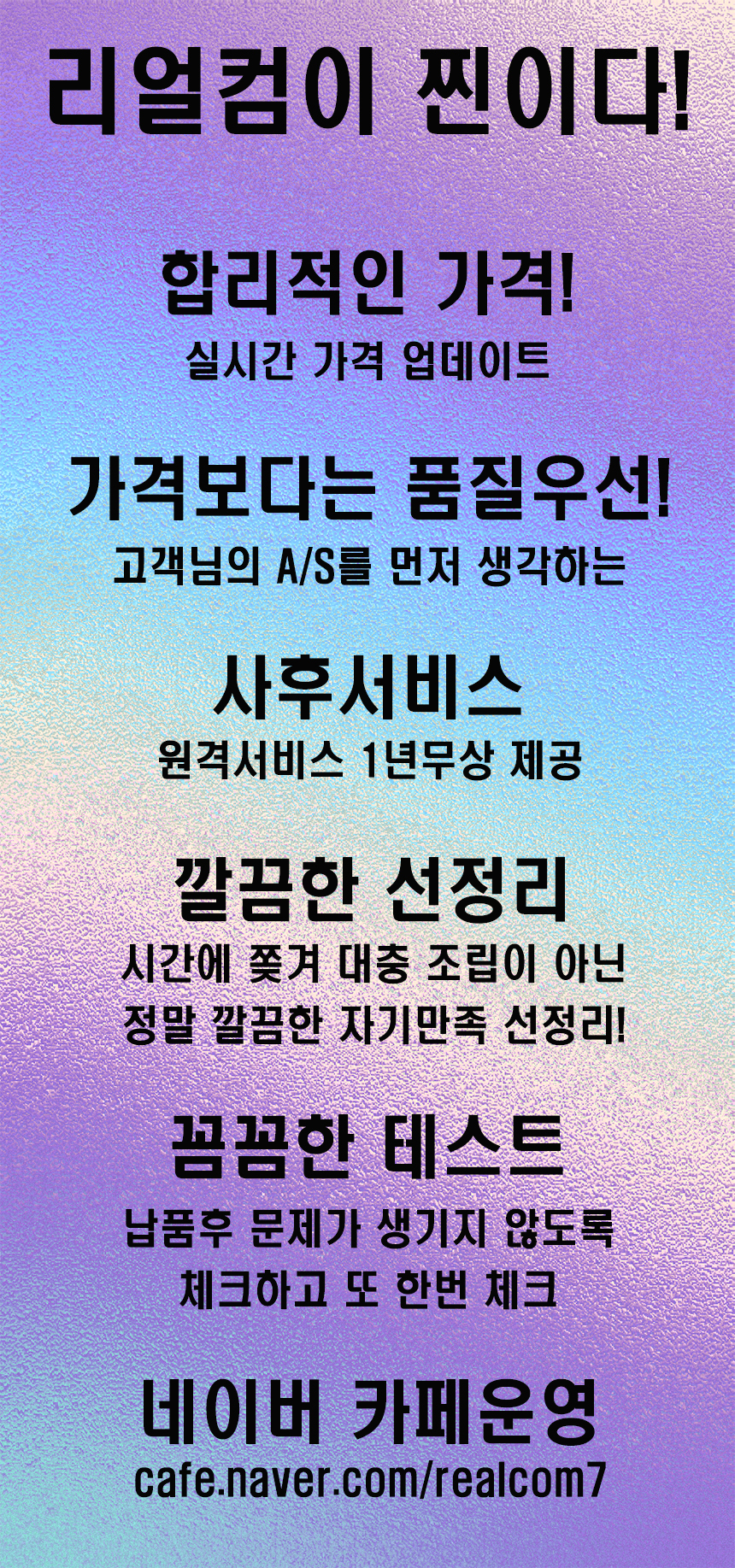 합리적인 가격과 훌륭한 서비스를 원하신다면 “리얼컴”을 믿고 방문하시면 됩니다.